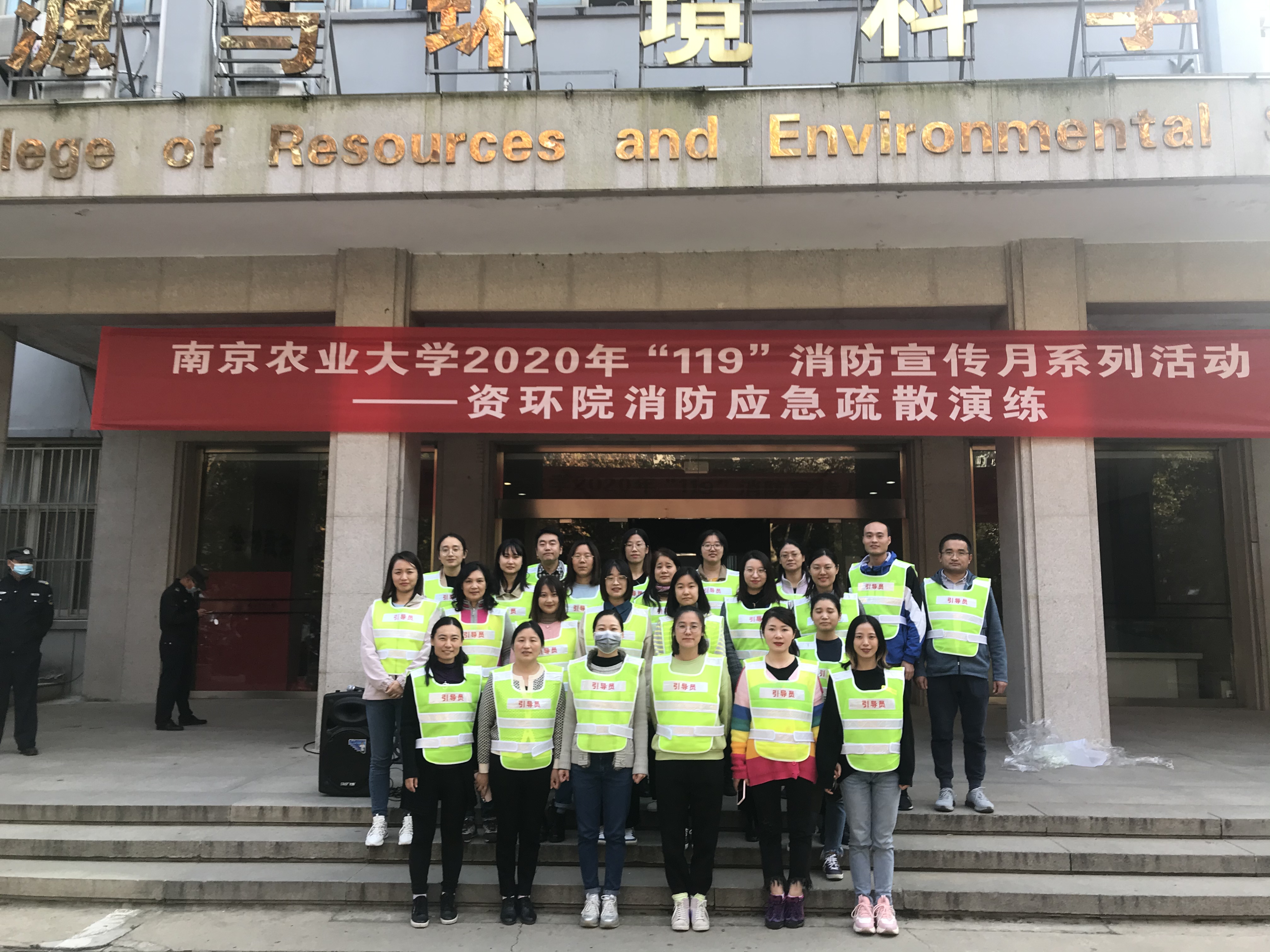 下午15:30演练正式开始,首先相关实验室师生和物业人员赶到虚拟火灾现场用灭火器和消火栓灭火,并启动声光报警装置、拨打火警“119”和学校保卫处电话,随着消防广播的响起,资环楼内师生迅速弯腰、捂住口鼻在引导员的指引下从最近的消防口有序撤离,同时,校园110消防队迅速赶到现场配合富贵山消防中队消防员进行灭火,校医院医护人员也在第一时间赶到现场对模拟伤员实施检查、包扎等抢救措施。最后所有人员成功撤离资环楼,并在资环楼北门空地集合。