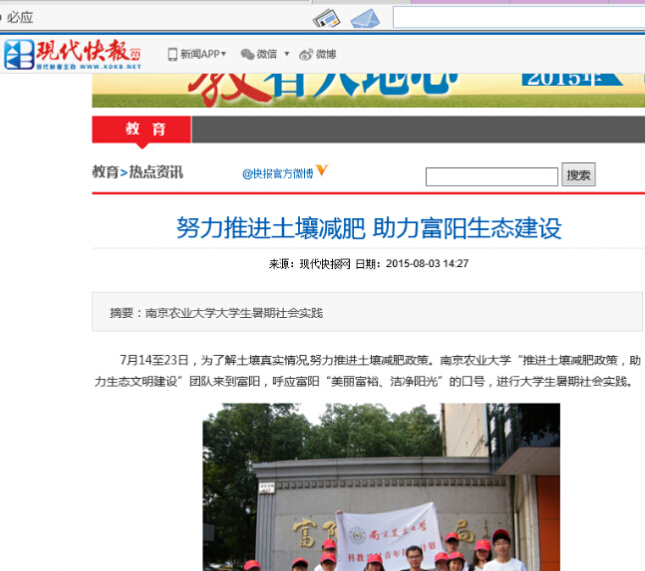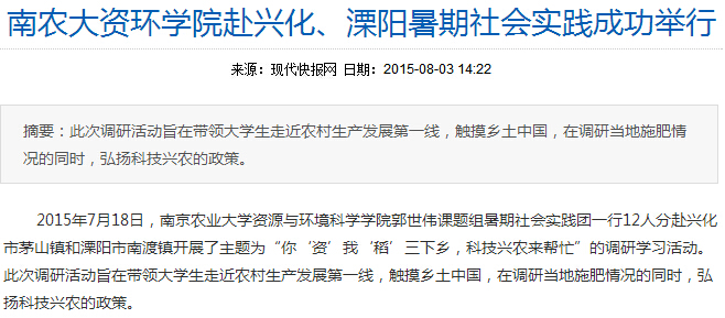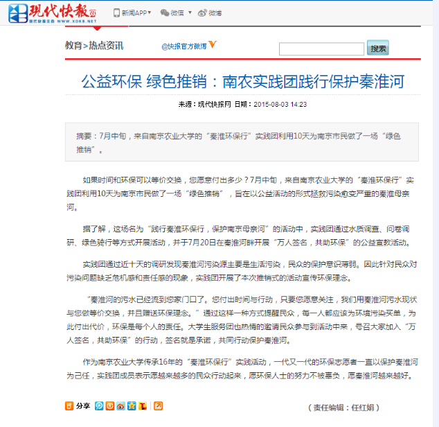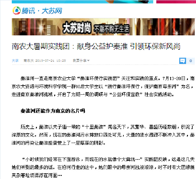 在前后大约为期一月的社会实践中,资环学子不仅取得了真实的调查数据和自身的成长提高,还很荣幸的受到了现代快报、腾讯新闻等社会各界媒体的报道。