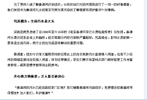 在“秦淮环保行”这一主题的实践活动中,团队成员通过问卷调查,绿色骑行等创意新颖的方式,在秦淮河畔刮起了一场环保风暴,他们的一言一行也受到了很多家媒体的关注。