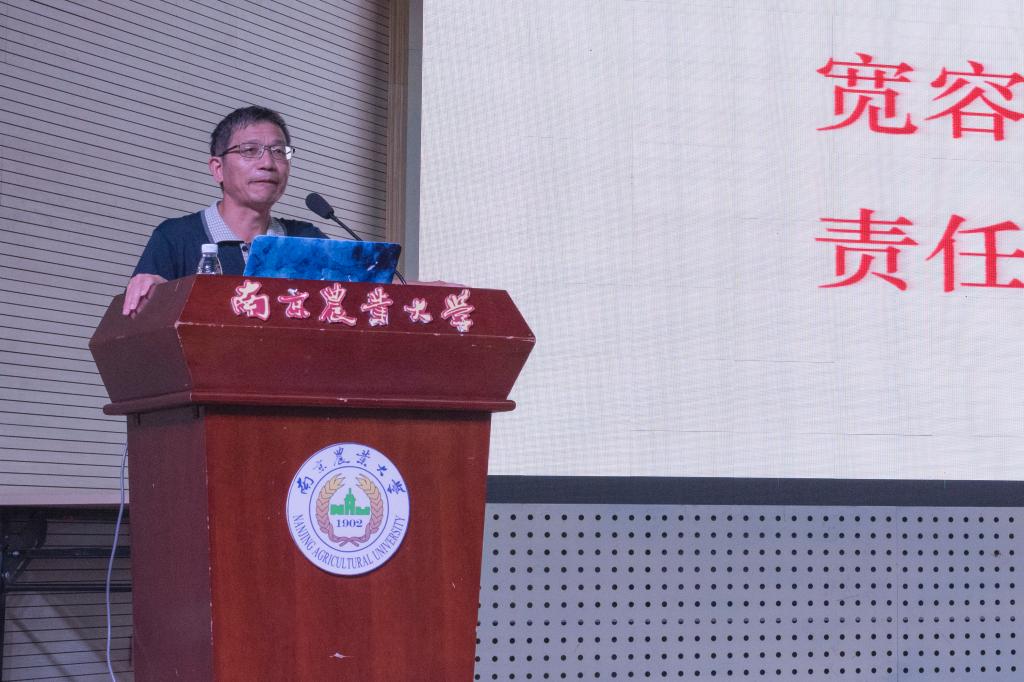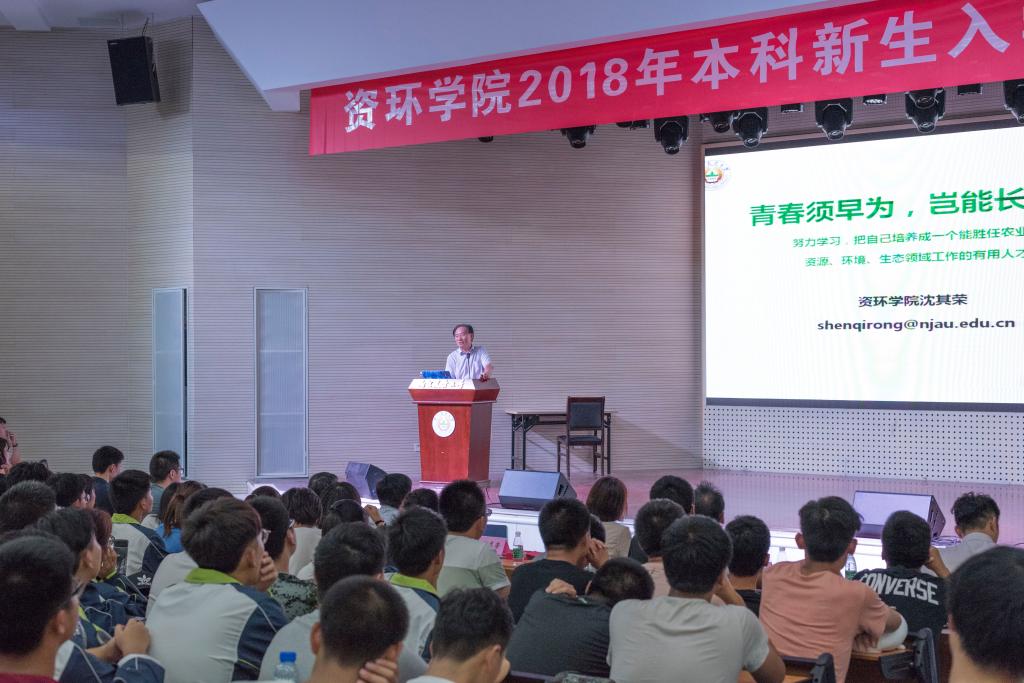 随后,国家教学名师沈其荣教授就“青春须早为,岂能长青年”为学生做了专题报告。沈教授告诫新生要早点懂事,趁着青春年少奋发有为,鼓励新生努力学习,把自己培养成一个能胜任农业、资源、环境、生态领域工作的有用人才,要时刻牢记人生中最重要的“四个字”——目标、努力。沈教授表示,要实现人生目标,就必须要诚信做人、有博大胸怀;要刻苦努力、永不言弃;要敢于创新,挑战第一。沈教授提出,“素质教育不是空话,更不是培养油头滑脑的人,而是培养具有心理素质和业务能力强的人。”