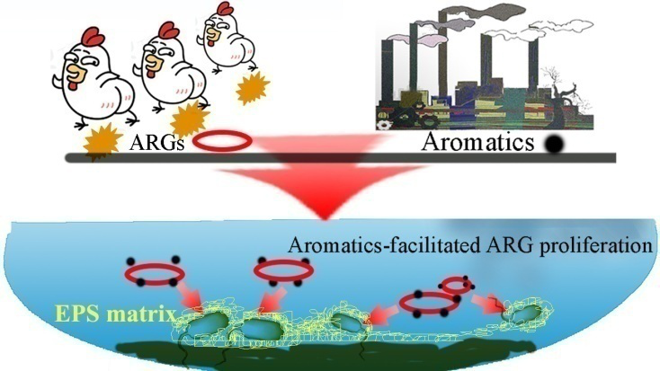 胞外聚合物质(EPS)是由微生物细胞分泌产生于胞外、由多糖、蛋白质、少量核酸等构成的一类聚合物质。它是控制“非生命-生命”关键带中污染物环境过程的重要节点,是联系“水/土壤-微生物”界面的重要界面介质,也是抗生素抗性基因赋存的汇。目前,抗生素抗性基因(ARGs)威胁全球公共健康,是人类面临的最为紧迫的环境污染风险之一。不同于传统化学品污染物,ARGs可依赖细菌宿主而自行增殖和传播,易受到多重环境介质的影响,这是导致其风险不完全可控的主因。本研究以取代性芳香族衍生物为例,研究了暴露于痕量芳香族衍生物下的游离态ARGs跨EPS界面、横向进入宿主细胞内的效率和效应,以全新的角度揭示芳香族与ARGs“狼狈为奸”,加剧基因污染风险的“帮凶”机制。