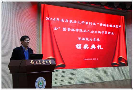 企业奖学金"、英语能力竞赛获奖学生代表孙光稷对设奖企业和学院表示了感谢,用自身经历与感悟诠释了兴趣是最好的老师,自信是必不可少的因素,而实力是最好的强心剂。省农科院资环所所长艾玉春作为校友获奖代表发言,他对母校给予的荣誉和老师、同事的帮助表示深深地感激。他告诫同学们要积极参加社会实践活动,勤奋创新,并请求大家对农科所持有一如既往的关心和支持,祝愿大家未来一切顺利。