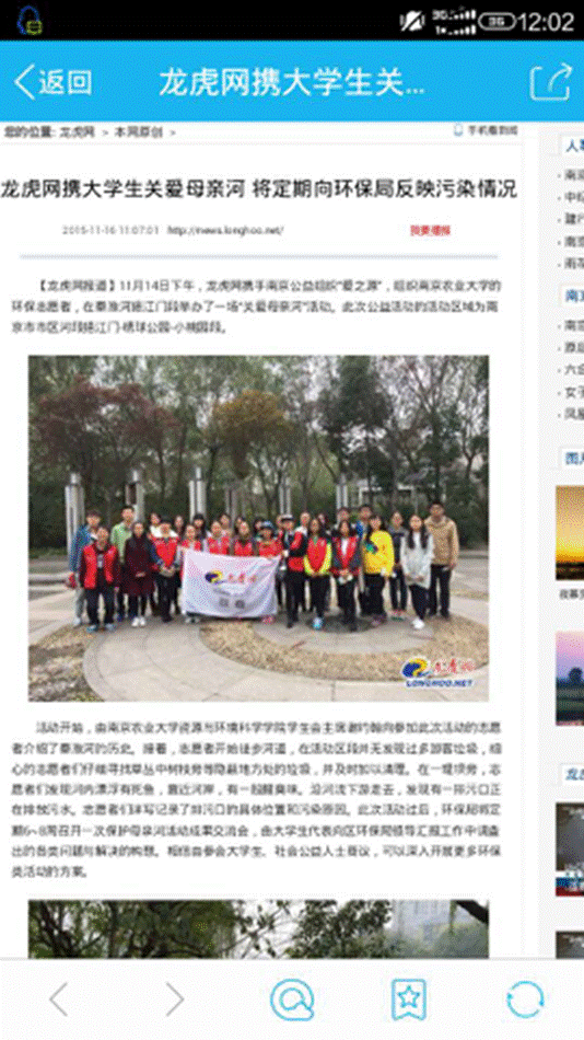 此次公益活动受到了社会各界的好评,活动新闻也在龙虎网上被报道。据悉,未来两天金陵晚报也会刊载此则新闻消息。资环青年心系环保,相信他们会把握专业知识,未来在环保的道路上越做越好,越走越远。