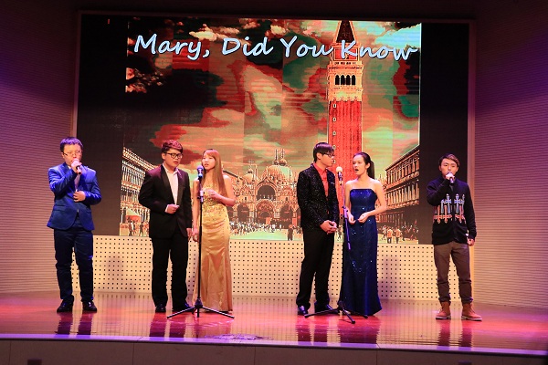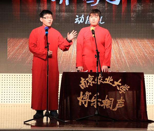 器乐团合奏的《感恩的心》一曲响起,晚会再次回到精彩的表演中。阿卡贝拉组合“Noise maker”给全场带来了声音碰撞出的动听歌声,赢得观众阵阵掌声。动医学院的两位同学带来的相声表演《养鸽子》,以幽默风趣的语言引得全场阵阵笑声。