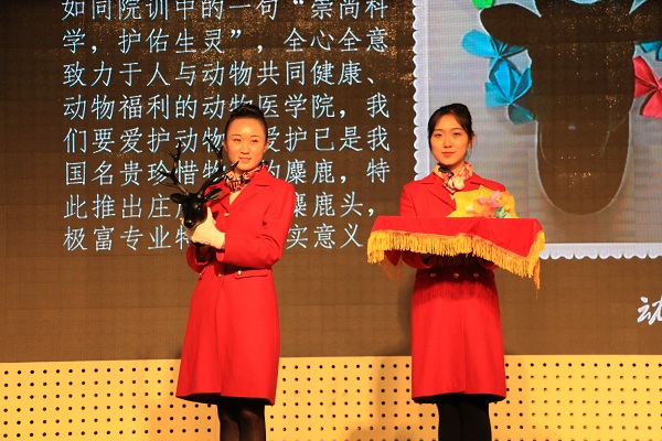 拍卖第二阶段,动医学院的拍品是一个麋鹿头墙壁挂件,如同动医学院院训中所说“崇尚科学,护佑生灵”,拍品呼吁我们要爱护动物,爱护我国名贵珍惜动物麋鹿。这件拍品出价过程出现了激烈的竞争,最后由来自动医院的朱同学以410元夺下。金融学院亮出的拍品是由金融学院志愿者与博爱的自闭症患者们一同制作的手工算盘。志愿者们精心制作了算盘本体,并为其刻上“诚朴勤仁”的校训。算盘框架上的趣味贴图,是自闭症孩子们一颗颗质朴内心的真实写照,同时他们用背面的爱心印刻向大家传递着善意。最终,外语学院党委副书记董红梅以188元将其收入囊中。