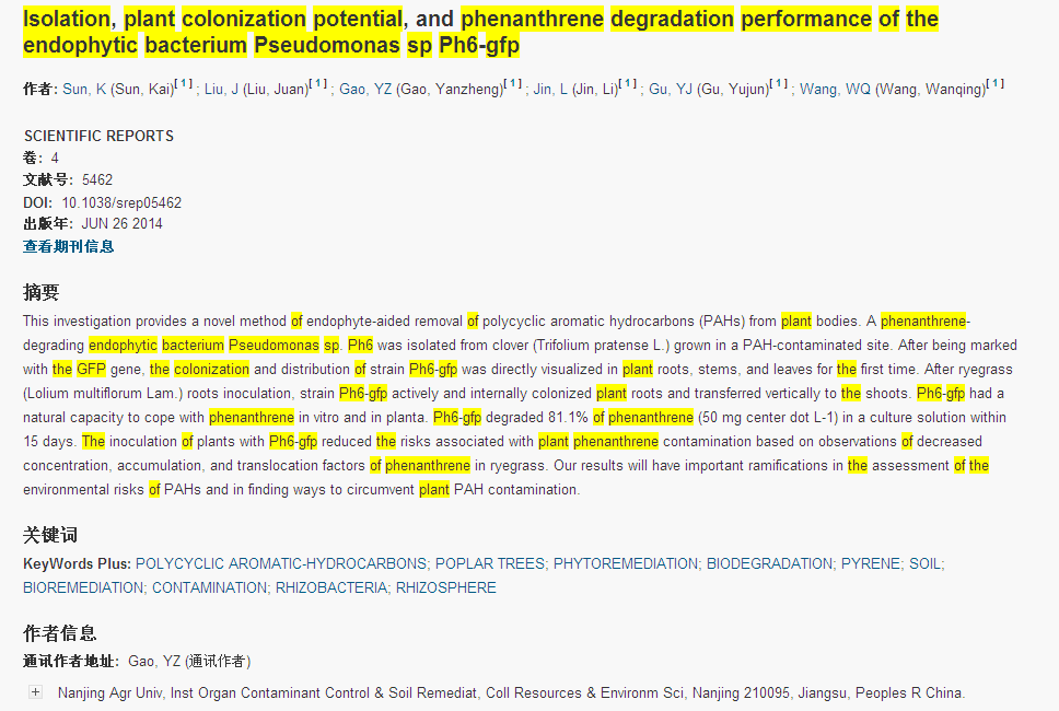 Isolation, plant colonization potential, and phenanthrene degradation performance of the endophytic bacterium Pseudomonas sp Ph6-gfp