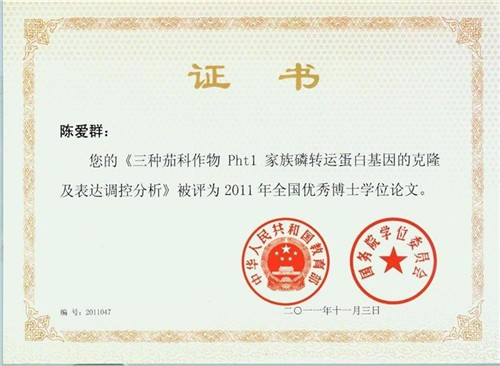 陈爱群的博士论文(指导教师:徐国华教授)《三种茄科作物pht1家族磷转运蛋白基因的克隆及表达调控分析》获2011年全国优秀博士学位论文