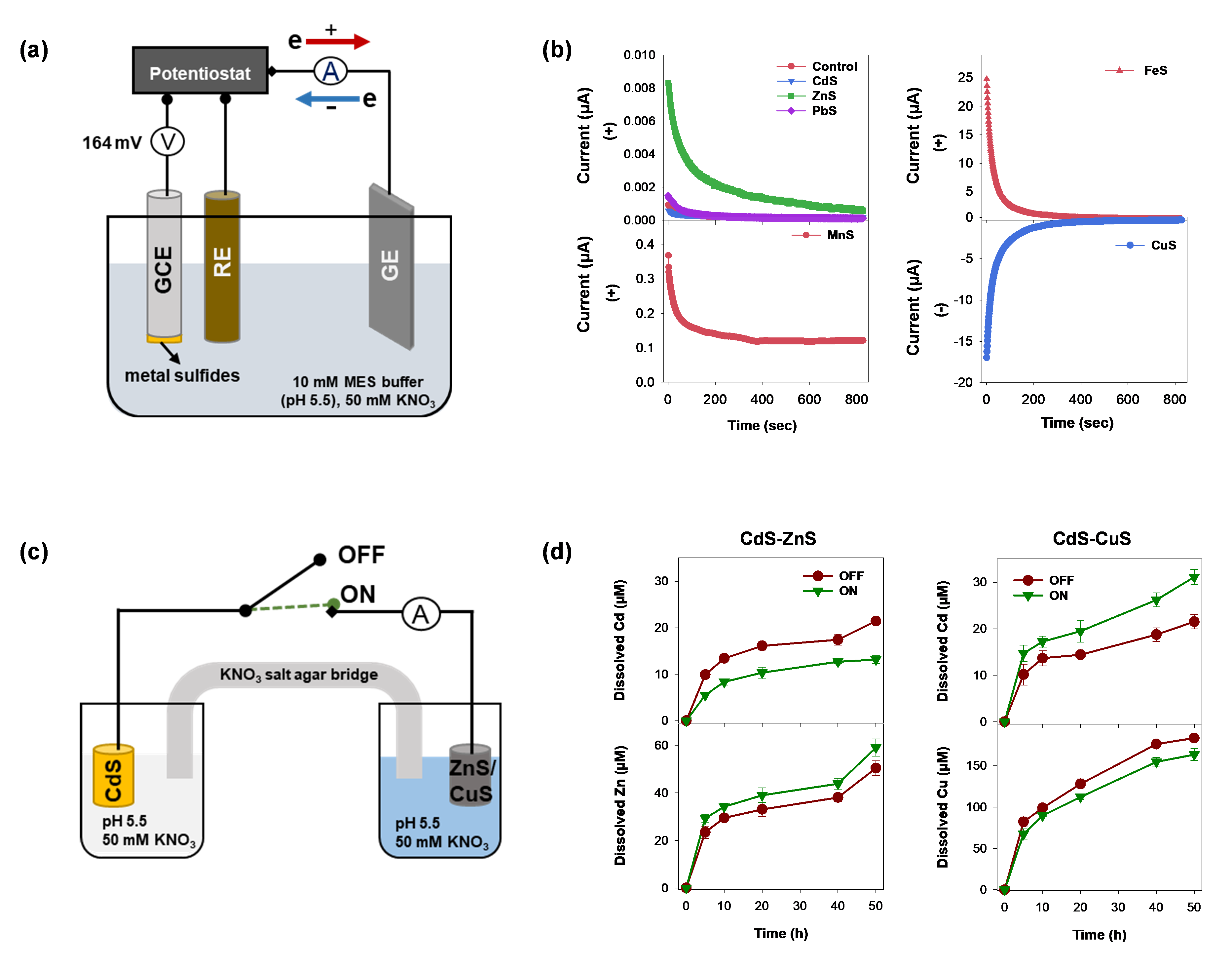 环境生物学团队前期发现了不同土壤镉的释放速率跟土壤Zn/Cd比例存在关联,通过一系列的微宇宙土壤培养试验,揭示了淹水阶段生成的不同金属硫化物对氧化阶段镉硫化物的氧化溶解存在截然不同的效应,ZnS或MnS的存在会抑制CdS的氧化溶解,而CuS会促进CdS的氧化溶解,PbS对CdS的氧化溶解影响很小(图1b)。在此基础上,该团队通过电化学分析(图2)、土壤胶体原位表征、稳定同位素标记、光谱和能谱分析等多个实验,首次揭示了原电池(voltaic cell)效应是控制稻田土壤排水后镉释放速率的重要机制。