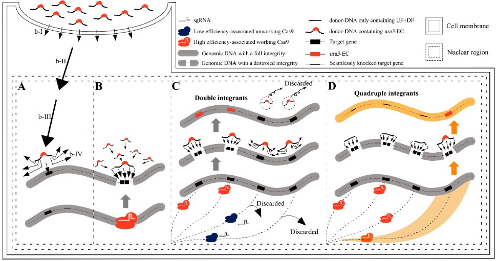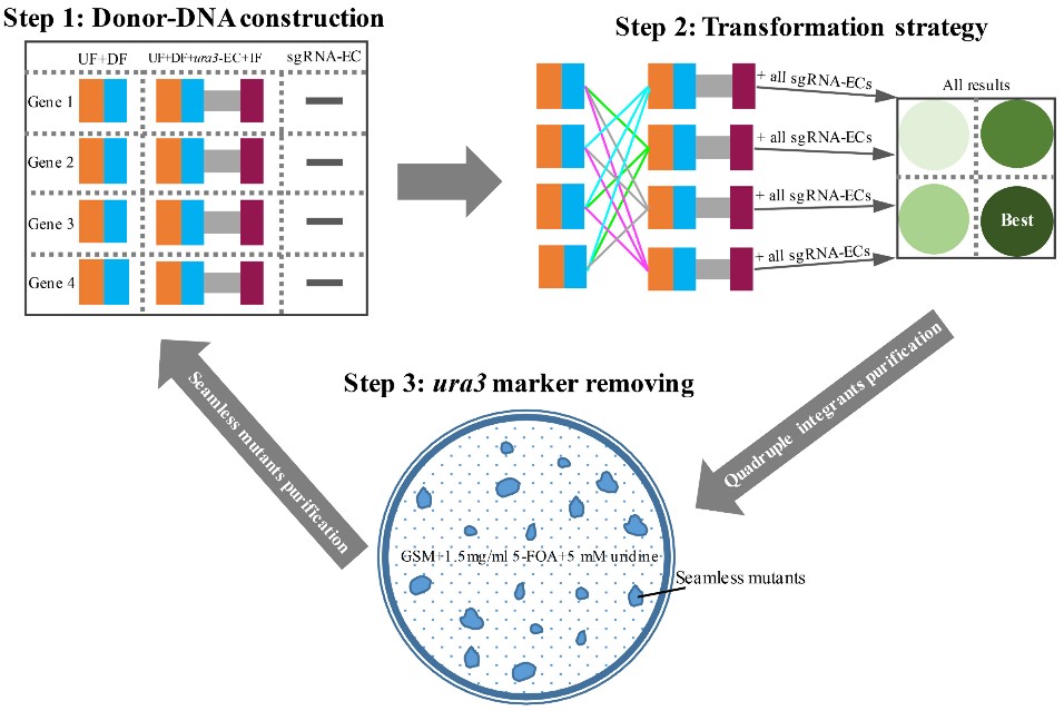 该研究首先采用正反筛选标记ura3构建特异性敲除片段,使其能够通过两次独立的同源重组事件分别实现敲除片段的特异性整合与标记基因的无痕去除,从而实现无限制的基因循环编辑。然而,无痕循环编辑过程中存在同源重组多态性现象,循环编辑依赖的同源重组方式只占总同源重组事件的约1/6,且重组效率低下无法实现多基因共编辑。针对上述难题,该研究通过引入CRISPR-Cas9系统大大提高同源重组发生基数(90倍),并利用偏向剪切策略将多态性的同源重组限制为循环编辑依赖性的同源重组方式,从而实现多基因循环共编辑。然而,sgRNA介导的竞争性抑制现象却严重影响多基因共编辑效率和稳定性,该研究最终通过将标记基因只固定在拥有最低效率sgRNA的基因敲除片段上克服上述问题,最终实现能够单次进行3-5个基因的无痕共编辑,在短期内能够循环操作大量基因。