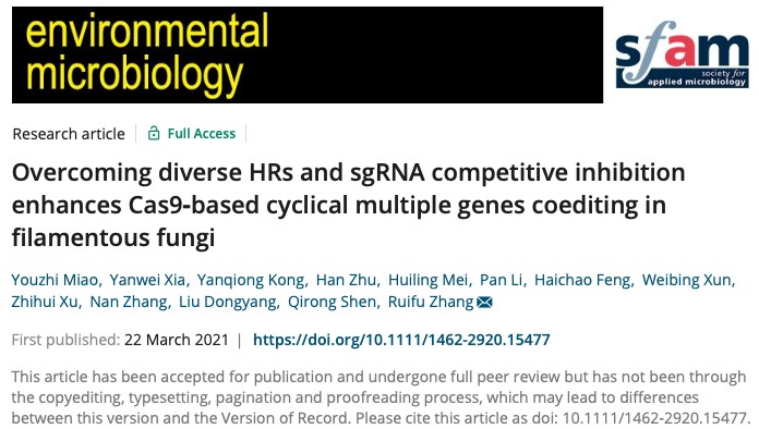 土壤微生物与有机肥团队张瑞福教授课题组在Environmental Microbiology上在线发表题为“Overcoming diverse HRs and sgRNA competitive inhibition enhances Cas9-based cyclical multiple genes coediting in filamentous fungi”的研究论文。该研究成功建立了一套高效的丝状真菌多基因无痕循环共编辑技术。