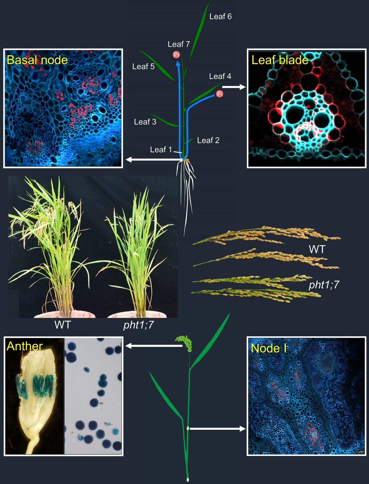 与其他已发现的磷转运体基因不同,OsPHT1;7在根部不表达,而是在老叶的维管束鞘和韧皮部薄壁细胞,以及节 (Node) 中两种维管束 (常规/分散维管束和肥大维管束) 的韧皮部表达。由OsPHT1;7在地上部特异的时空表达模式,结合其突变体植株的生理表型可知:(1) 该转运体在水稻磷素再分配过程的三个步骤 (1. 老叶维管束鞘;2. 老叶韧皮部薄壁细胞;3. 节) 扮演着“阀门”的角色;(2) 水稻磷素再分配需要质外体途径的参与 (不排除共质体途径的贡献)。另一方面,水稻生殖生长的单核小孢子期至三核花粉期,花药中的磷素会在短时间内大量积累。研究发现,该时期OsPHT1;7在花药中的表达量显著高于其他所有磷转运体基因,表明其对花药磷积累的重要贡献。对OsPHT1;7突变体植株的生理表型分析证实,OsPHT1;7的突变不仅影响水稻植株的生长 (株高、穗长降低),还显著抑制花药中的磷积累,导致结实率和产量下降80%以上。本研究为解析作物体内磷素周转的分子生理机制提供了新的线索,并为旨在提高作物PUE的分子育种工作提供了理论依据和基因资源。