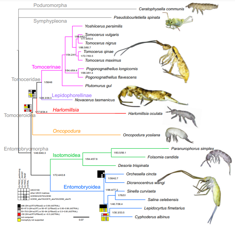 本研究对起源最古老的土壤六足动物类群长角跳目弹尾虫(Entomobryomorpha)展开了研究,使用低深度全基因组测序技术获取了长角跳目主要类群代表物种的基因组数据,从中提取了USCO(单拷贝直同源基因)氨基酸标记和UCE(超保守元件)核苷酸标记;基于不同标记覆盖度的数据集,使用多种方法(partitioning ML,GHOST,PMSF,ASTRAL,PhyloBayes)重建了长角跳目的系统发育树,并综合使用方法适合度、形态特征证据和拓朴结构检验评估了不同建树结果的可靠性。结果表明基于USCO标记和异质性模型(CAT+GTR,LG+PMSF(C60))重建的系统发育关系最为可靠。该结果支持鳞跳总科(Tomoceroidea)为长角跳目的早期分支,长角跳总科(Entomobryoidea)和等节跳总科(Isotomoidea)为姊妹群;在鳞跳总科内部,鳞跳科(Tomoceridae)为单系群,而异齿跳科(Oncopoduridae)为并系群,其中Harlomillsia属与鳞跳科关系更近,据此建立新科Harlomillsiidae fam. nov.,为解决土壤动物演化之谜提供了理论依据。