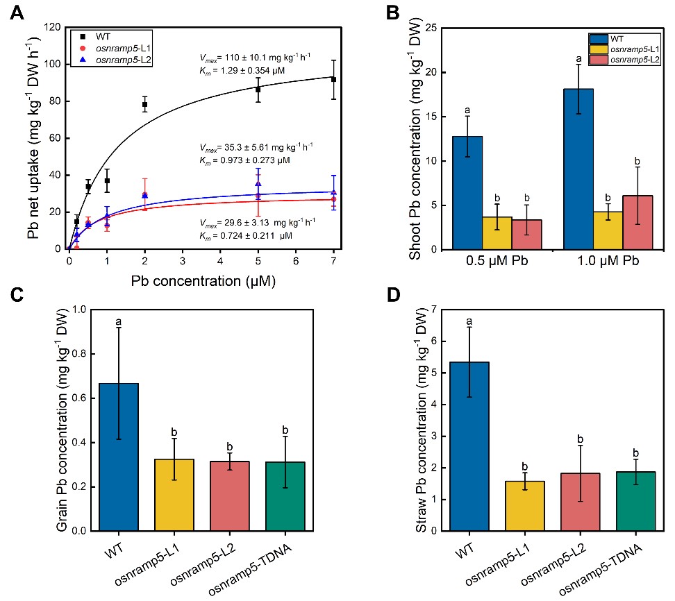 图2. 水稻根系OsNRAMP5是吸收Pb的主要途径