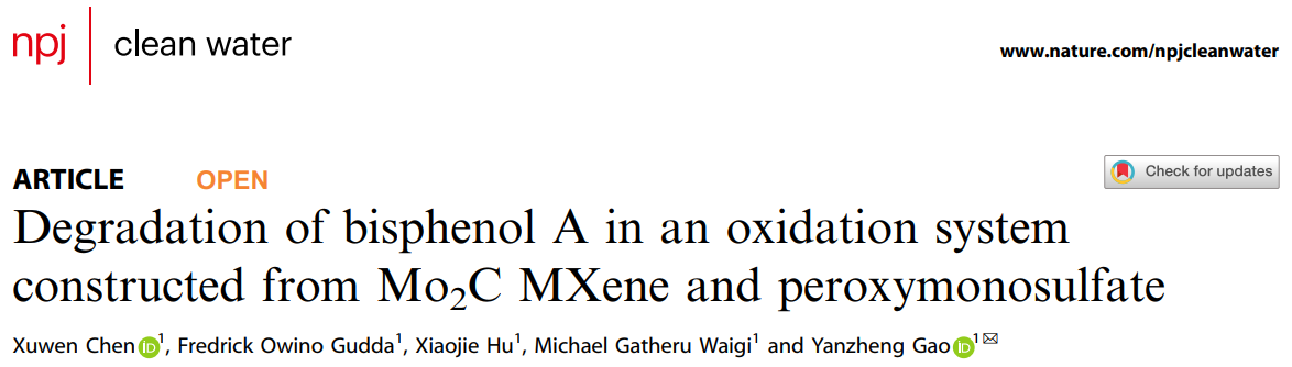 该成果以“Degradation of bisphenol A in an oxidation system constructed from Mo2C MXene and peroxymonosulfate”为题,发表在npj Clean Water上。青年研究员陈旭文为论文第一作者,胡小婕、Fredrick Owino GuddaMichael Gatheru Waigi参与了研究工作。该研究得到国家自然科学基金组织间合作研究项目等资助。