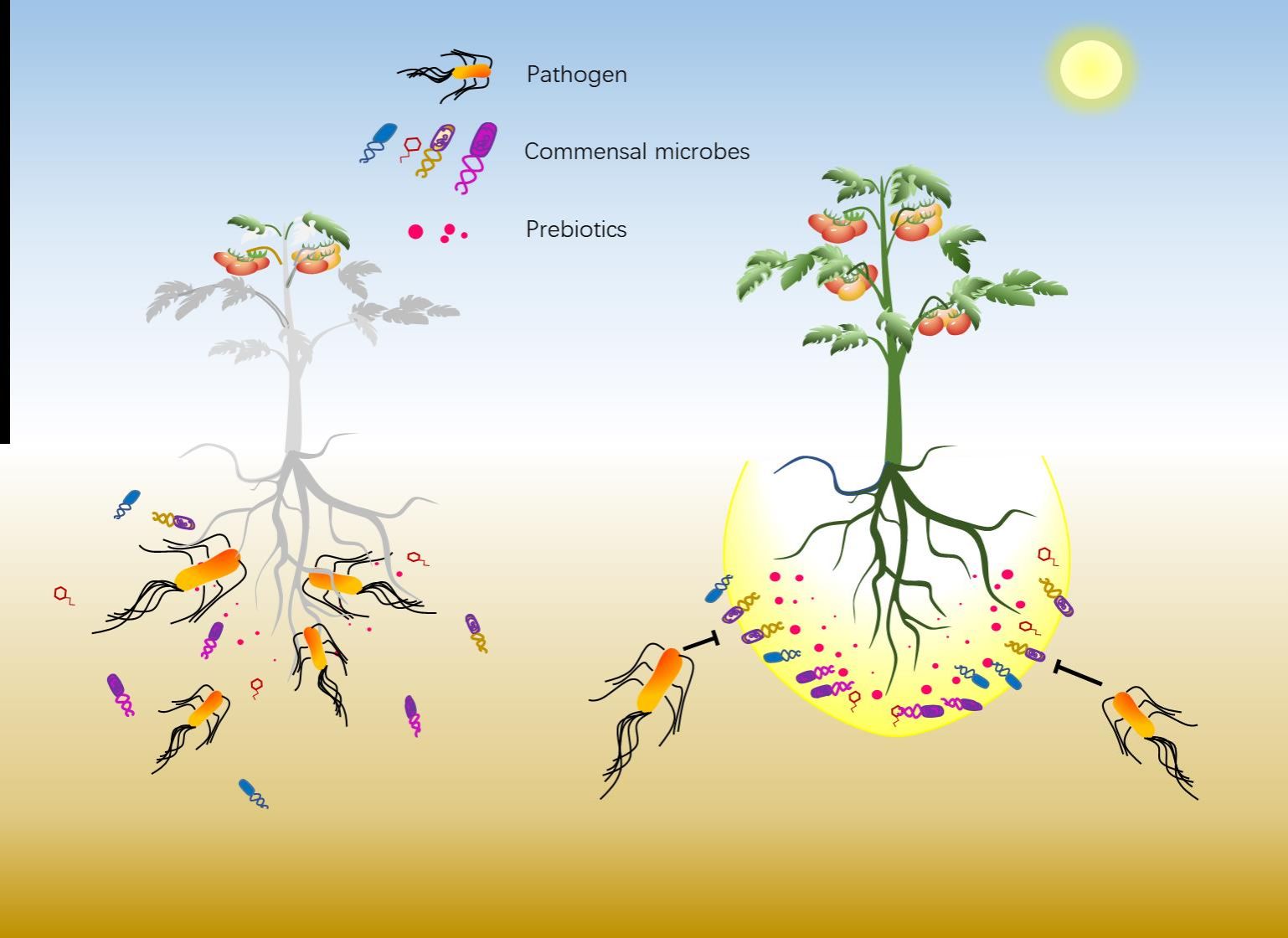 近日,Nature Communications在线发表了沈其荣院士团队的研究成果:Tapping the rhizosphere metabolites for the prebiotic control of soil-borne bacterial wilt disease。该研究通过解析番茄发病和健康植株的根际代谢组,挖掘潜在的益生元,并结合多组学手段明确了益生元驱动根际微生物维持植物健康的微生态机制。研究成果标志着我国土传病害防控进入益生元精准调控阶段。