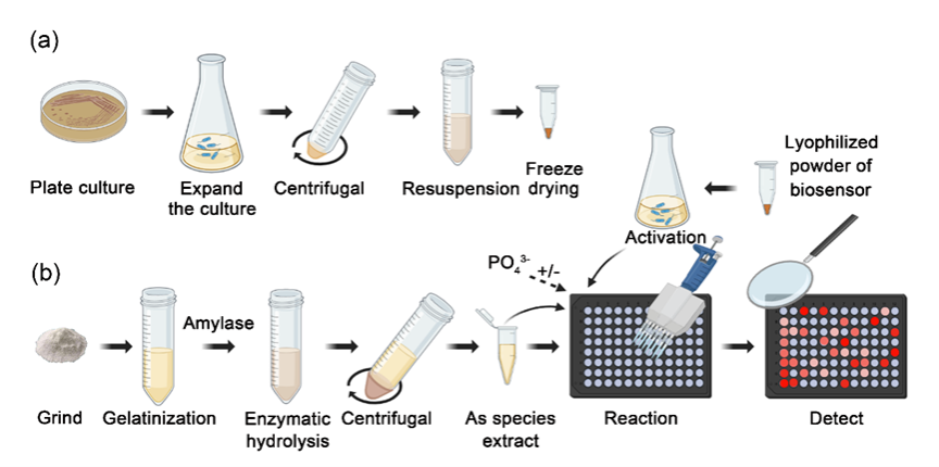 汪鹏教授课题组开发了一种稻米iAs检测新方法(图1),利用天然微生物传感器E. coli AW3110 (pBB-ArarsR-mCherry) 结合淀粉酶水解提取砷形态,实现稻米中iAs的高通量和定量检测。本研究将该生物传感器制成了操作便捷的试剂盒,包括酶标板、α淀粉酶,以及生物传感器细菌冻干粉。生物传感器被制成冻干粉可以提高该方法的使用范围、延长保质期、简化操作步骤和缩短测试时间(图3)。用该试剂盒在12 h内能检测超过200个稻米样品,而常规方法HPLC-ICP-MS在同样的时间内仅能测定40个样品。