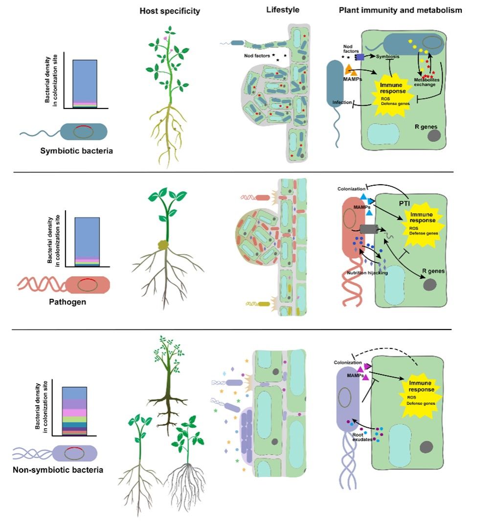 该文以植物益生菌的根际定殖过程为线索,从根际的趋化运动、根表黏附、根表生物膜形成和内生化这四个方面详细总结了其中涉及的细菌信号感知和微生物分子调控途径,并讨论了根系分泌物和植物免疫对根际定殖的影响及作用机理。该文还总结了“呼救”反应对根际益生菌定殖的促进作用,详细比较了根际益生菌与植物土传病原菌和植物共生菌根际定殖过程的异同,文章最后提出了增强植物益生菌根际定殖能力的调控和驯化策略。