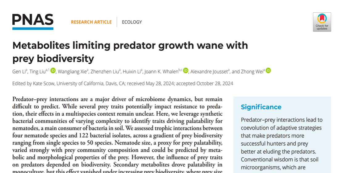 科研团队揭示了微生物多样性如何塑造捕食者体型大小的生态学机制,挑战了传统微型生态系统中捕食-被捕食关系以毒性为主导的假说。相关成果以题为“Metabolites limiting predator growth wane with prey biodiversity”发表在国际权威期刊《PNAS》