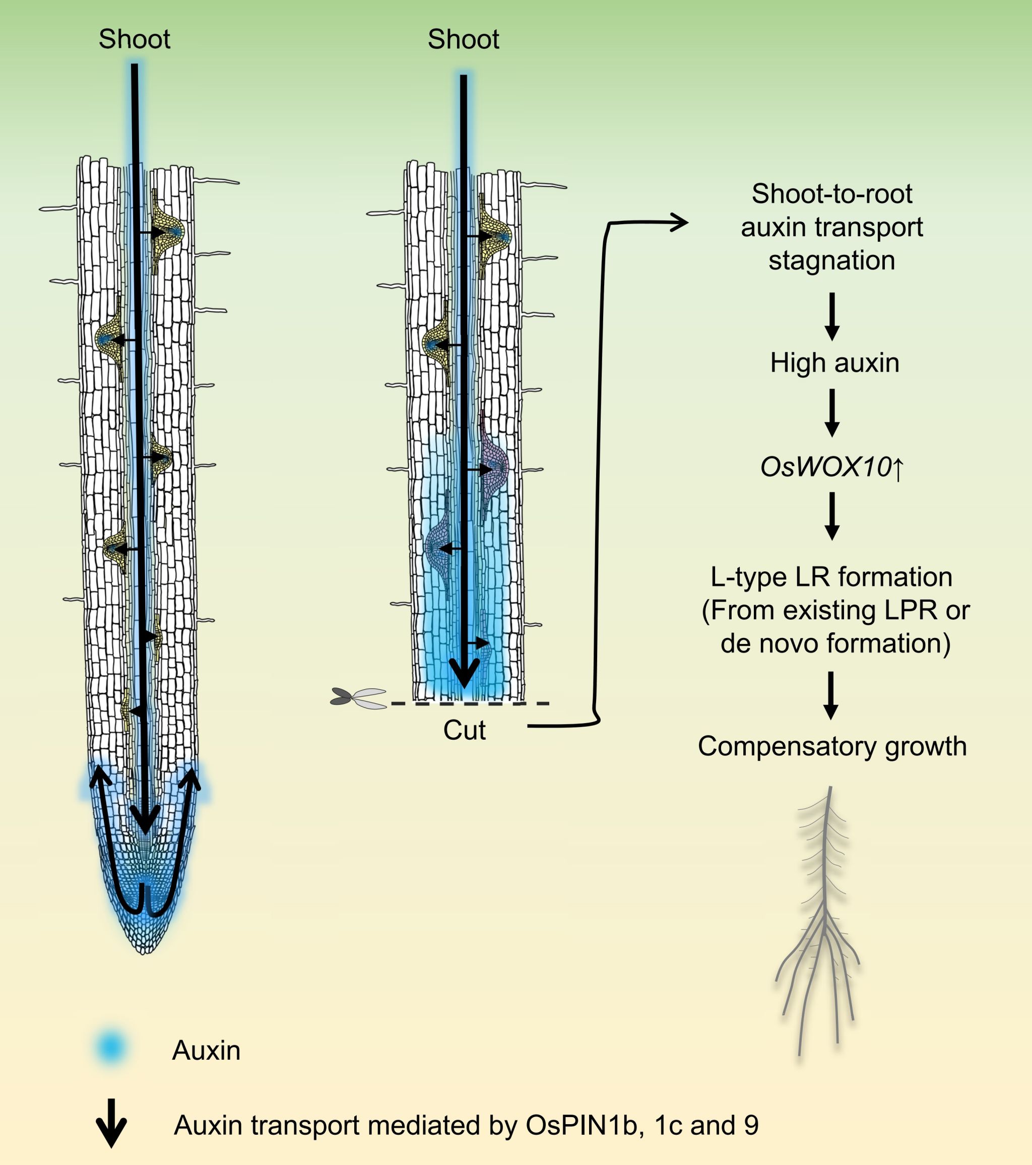 图2. 水稻地上部至根部的生长素转运激活断根补偿性生长的机制模型