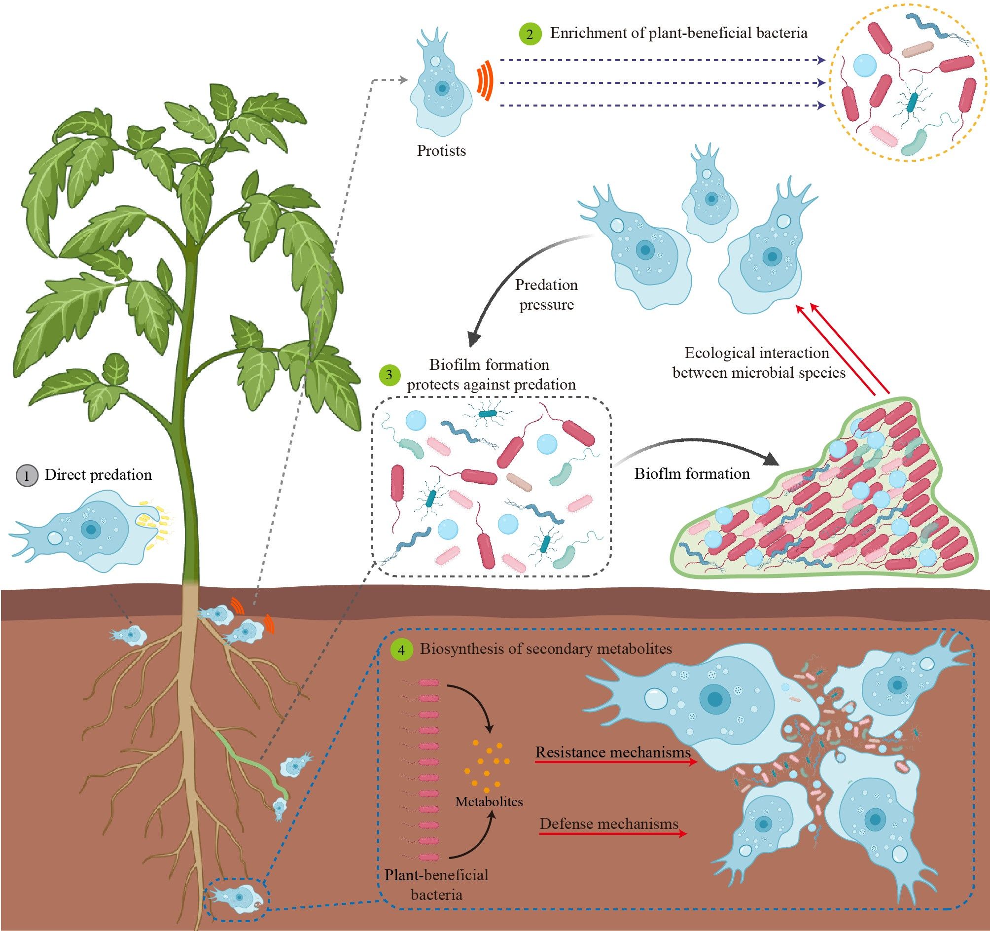 土壤微生物组对植物健康生长至关重要,吞噬型原生生物(即:原生动物)是土壤微食物网的重要组成,它们通过捕食作用调控并影响着微生物群落组成与功能,但土壤原生动物如何与根际菌群互作影响植物健康生长的机制还未充分阐明。