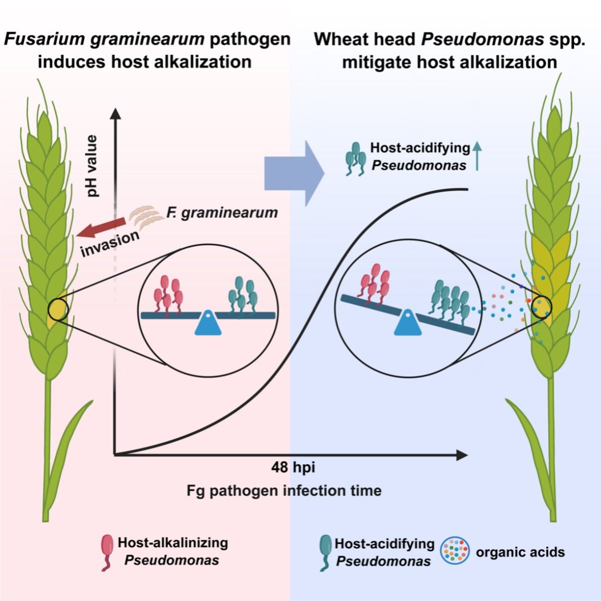 近年来,由于气候变化、大面积小麦/玉米轮作和秸秆还田等因素的影响,赤霉病在我国呈加重发生态势,严重威胁我国农业生物安全和粮食安全。在该研究中,作者揭示了小麦穗部微生物群落在病原菌侵染过程中通过调控寄主局部pH参与病害进程的关键微生态机制。研究发现,赤霉病菌侵染小麦穗部时,会通过诱导寄主组织碱化来增强其致病力。然而,小麦穗部天然微生物群中潜伏着一类能够“以酸制碱”的功能微生物——寄主酸化型假单胞菌。随着病原菌的侵入,这类假单胞菌在穗部富集,并通过分泌多种有机酸降低病原菌诱导的寄主碱化效应,从而抑制赤霉病发生。值得注意的是,寄主酸化型假单胞菌的富集与有机酸分泌并非简单的被动反应,而是病原菌—寄主—微生物三方互作下的精细化生态调控过程。它们通过主动调节小麦穗部微环境,破坏病原菌的碱化侵染策略,从而构建有利于寄主防御的“酸性微生态屏障”。为验证这一机制在赤霉病防控中的应用潜力,研究团队连续两年开展了赤霉病的田间防效试验。结果显示,寄主酸化型假单胞菌代表菌株(黎巴嫩假单胞菌HacidP1)在田间表现出稳定的防病能力,对小麦赤霉病的防控率达60%以上,验证了微生物介导的“酸化防病”理论在赤霉病防控中的应用潜力,为小麦赤霉病的可持续治理提供了微生态干预新路径。