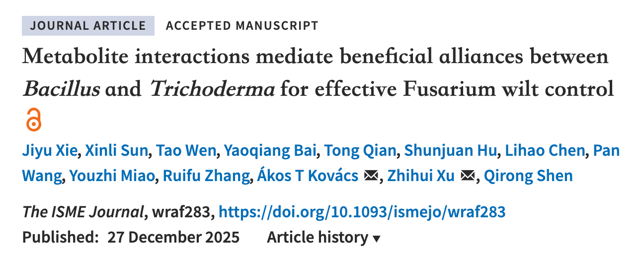 沈其荣院士团队张瑞福教授课题组联合荷兰莱顿大学在TheISME Journal发表最新研究成果。该研究以贝莱斯芽孢杆菌SQR9(Bacillus velezensis)与哈茨木霉NJAU 4742(Trichoderma guizhouense)构建的互作体系为模型,通过全球土壤宏基因组分析、转录组分析、代谢物鉴定和基因突变验证等,系统揭示了跨界有益微生物如何通过代谢物介导并形成稳定联盟,协同对抗病原菌FOC (Fusarium oxysporum)。