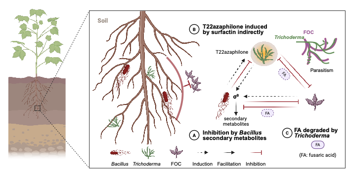 在微生物肥料的多菌株复配领域,传统认知认为存在拮抗作用的微生物类群,因其潜在的互作冲突,不适合作为复合菌剂进行开发与应用。然而,以英国牛津大学Kevin Foster教授为代表的微生物生态学家提出了“竞争主导菌群稳定”观点,该观点认为:微生物群落内部竞争是驱动菌群结构稳定的关键动力。那么,在植物根际微生态系统中,引入具有竞争潜力的外源功能微生物,可潜在强化根际菌群的竞争强度,进而有效抑制土传病原菌的种群丰度。芽孢杆菌(Bacillus)与木霉(Trichoderma)是两类重要的植物促生和生物防控微生物,在农业应用中常表现出协同增效。然而,它们在实验室条件下长却表现为相互拮抗,这一“实验室拮抗-田间协同”的矛盾现象背后的分子生态机制未知。