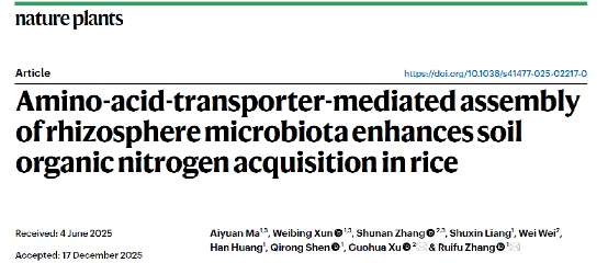 沈其荣院士团队张瑞福教授课题组与徐国华教授团队合作,在国际权威期刊《Nature Plants》上发表了题为“Amino acid transporter-mediated assembly of rhizosphere microbiota enhances soil organic nitrogen acquisition in rice”的研究成果。该研究整合植物遗传学、微生物组学与土壤有机培肥研究,揭示了水稻通过氨基酸转运蛋白的遗传变异、进而控制根际与有机养分分解和吸收相关的微生物组装配、从而达到在肥沃或有机培肥土壤中高效利用氮素养分的适应性进化策略,为提高有机养分利用效率和有机肥效提供了理论基础和微生物菌群产品。