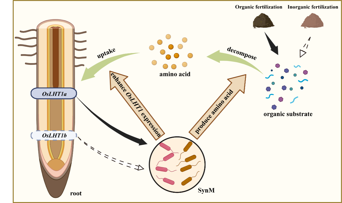 土壤中90%以上的氮素以有机氮形式存在,而其生物有效性依赖于土壤微生物的分解作用。研究团队前期发现水稻氨基酸转运蛋白OsLHT1基因的遗传变异使粳稻的氨基酸吸收能力显著高于籼稻。在该项研究中,通过全国水稻主栽区不同品种与土壤肥力的调查,发现OsLHT1a单倍型(主要为粳稻)的氨基酸高效吸收性状与其主要有机质高的种植环境及根际富集的功能微生物特征相关。利用从粳稻根际筛选的富集菌株,构建了具有协同提高水稻氨基酸吸收效率的合成菌群SynM。该菌群提高水稻根系吸收氨基酸(15N标记的天冬氨酸)达1.4倍。利用oslht1突变体及回交材料,明确SynM的根际组装过程主要受OsLHT1基因控制,并且该组装过程可以通过“遗留效应”促进后茬水稻对有机氮的利用。田间条件下,SynM与有机肥配施,可显著提高有机肥的当季肥效,水稻增产12.4%。该研究阐明了“宿主基因调控-根际菌群耦合-培肥措施强化”的协同机理,为培育有机养分高效作物新品种提供了微生物协同育种新途径和新靶标。