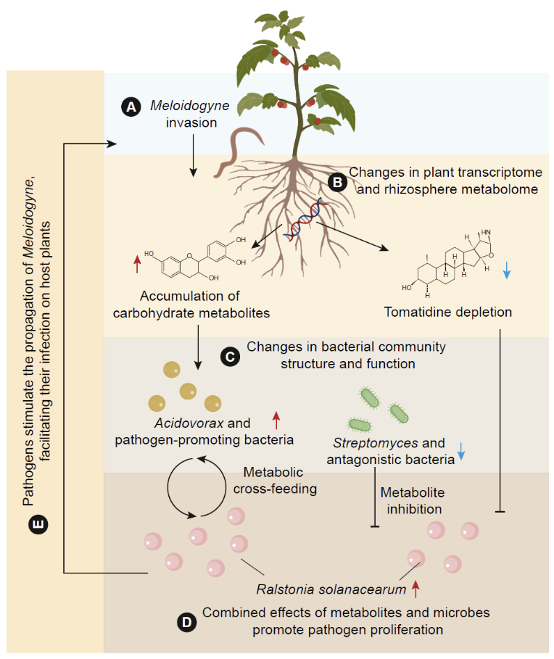 研究团队首先整合全球多项试验数据发现,根结线虫的存在显著加重了病原菌,尤其是青枯菌对植物的危害程度。通过构建植物—线虫—微生物三者互作实验体系,研究人员进一步揭示了其内在机制。结果表明,根结线虫入侵可显著改变植物根系代谢物组成,使根际中糖类物质明显增加,而部分抑制性碱类物质显著降低。这种变化促进了青枯菌及其“协同菌群”的富集,同时抑制了链霉菌等有益微生物的生长。进一步研究发现,增加的糖类物质和青枯菌的富集反过来又促进了根结线虫的生长与定殖,从而形成虫-菌协同侵染的正反馈过程。
