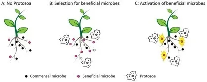 众所周知,根际微生物组极其复杂,其在整个植物生长过程中都会发生显著变化,对植物生长和健康有重要的影响。目前,大多数根际微生物组研究集中在细菌和真菌,尚不清楚其他微生物,尤其是关键的微生物捕食者——原生动物是否影响植物健康。先前有大量文献报道原生动物能够选择性捕食细菌,反过来细菌也会对原生动物的捕食产生防御(产生抑菌性物质)。原生动物与细菌互作特征让我们猜想:原生动物群落及其与细菌群落的互作可能在保护作物健康方面发挥重要作用(图1)。