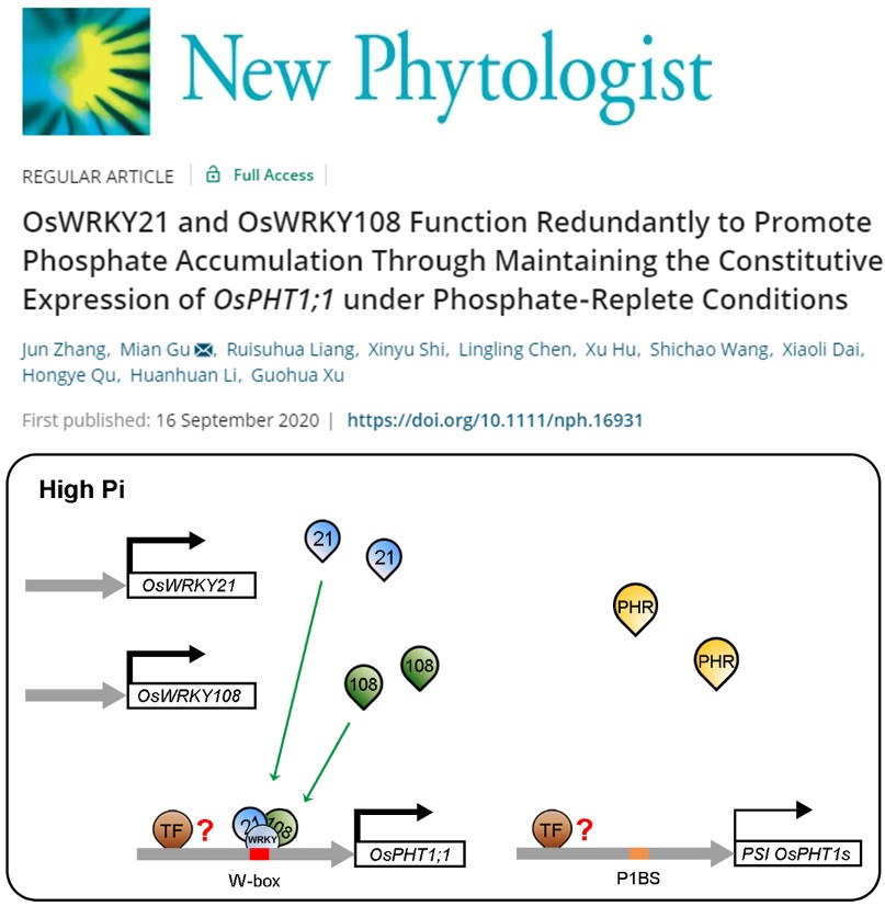 近日,徐国华教授团队在《New Phytologist》发表了题为“OsWRKY21 and OsWRKY108 function redundantly to promote phosphate accumulation through maintaining the constitutive expression ofOsPHT1;1under phosphate-replete conditions”的论文(doi: 10.1111/nph.16931)。该研究以其课题组已报道的一个在富磷条件下表达的磷转运体基因OsPHT1;1为切入点,深入研究了其调控机制(图1)。
